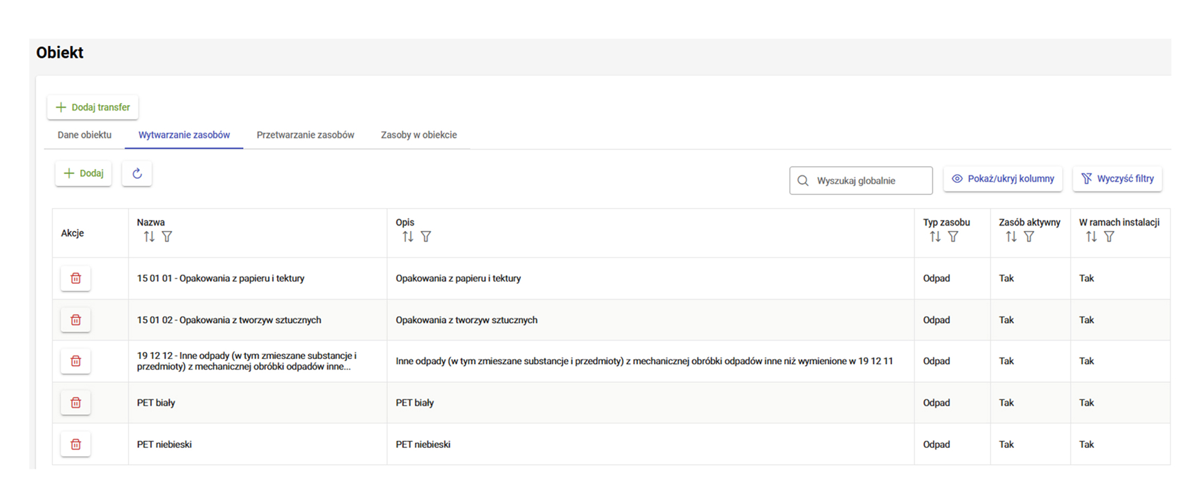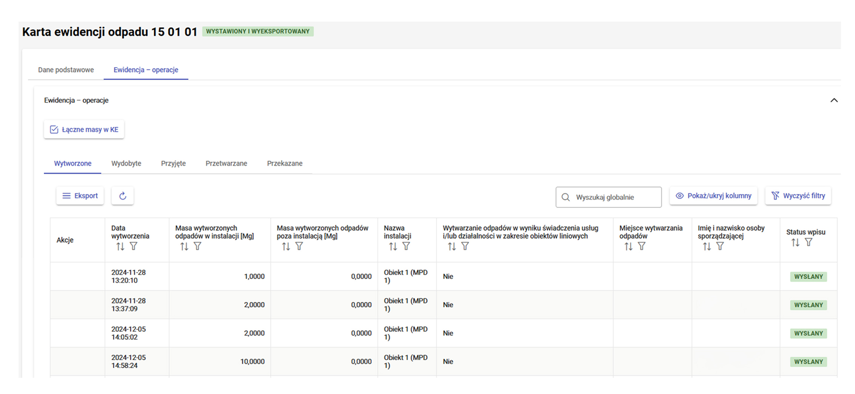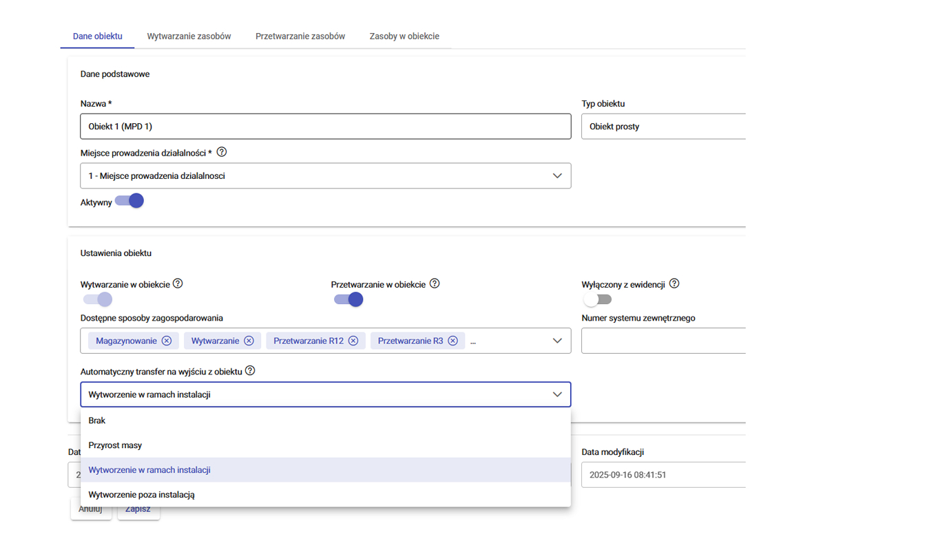 System zapewnia dwutorowość rejestracji wytworzenia odpadów, oprócz standardowej ścieżki manualnej możliwe jest automatyczne wytworzenie odpadu wraz z zatwierdzeniem operacji wywozu. System dodatkowo kontroluje stany magazynowe w obiektach i nie dopuści do dublowania operacji. Rejestracja wytworzenie odpadu wiąże się nie tylko z aktualizacją stanów magazynowych w obiektach ale także z automatyczną, bieżącą aktualizacją wpisów w kartach ewidencji.