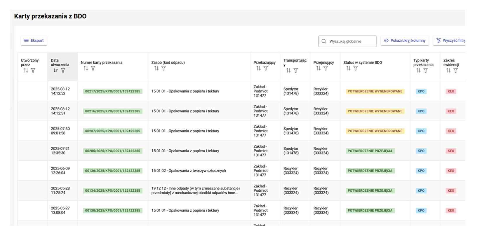 Karty ewidencji odpadów są tworzone w pełni automatycznie, na podstawie operacji dodawanych w systemie oraz eksportowane do BDO również całkowicie automatycznie zgodnie z konfiguracją systemu. System posiada podgląd danych w Kartach ewidencji utworzonych w systemie oraz walidator zgodności z danymi w BDO.