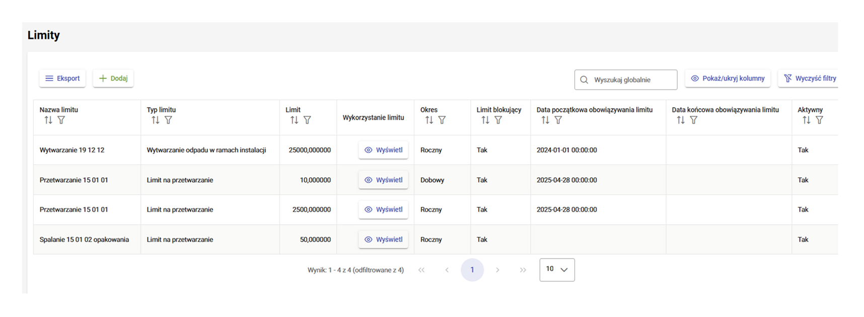System pozwala na mapowanie limitów na wytwarzanie odpadów zgodnie z decyzjami czy też z wewnętrznych potrzeb procesowych. Limity dostępne w systemie mogą być blokujące lub informacyjne z rozbiciem na poszczególne kody odpadów lub globalne. System podczas rejestracji operacji w obrębie obiektu waliduje dostępność limitu i odpowiednio sygnalizuje stan wykorzystania danego limitu, a w przypadku limitu blokującego nie dopuści do wykonania danej operacji.