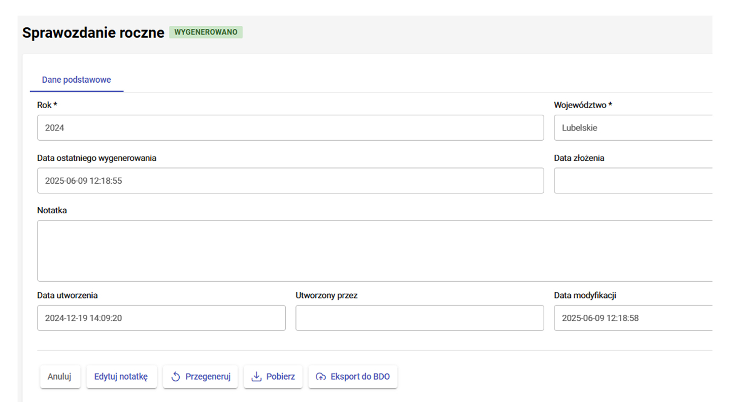 Wszystkie widoki systemu posiadają funkcję generowania zestawień do pliku Excel. Dodatkowo system posiada funkcję automatycznego generowania tabel na potrzeby sprawozdania rocznego wytwarzającego na podstawie danych zawartych w kartach ewidencji w systemie. Tabele można wyeksportować do BDO ponieważ system automatycznie waliduje i tworzy sprawozdania dla wymaganych województw.